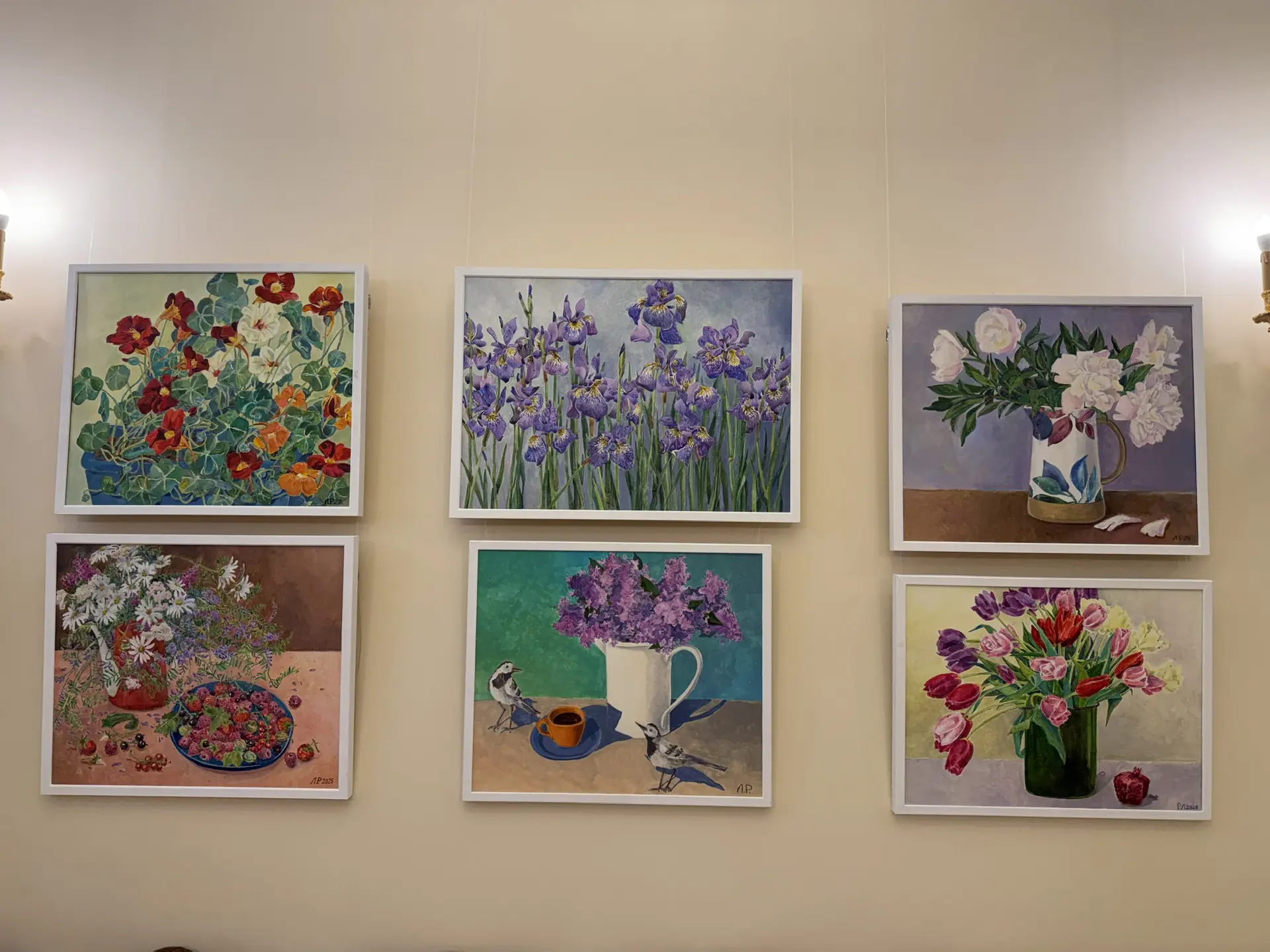 На выставке в Константиновском дворце представлено более пятидесяти произведений, выполненных в различных техниках. Главные герои экспозиции- цветы. Множество самых разнообразных видов садовых и полевых цветов (незабудки, настурции, розы, пионы, разные виды флоксов, вереск, горошек, лилии, колокольчики и др.) заполнили пространство радостным предчувствием весны и лета.